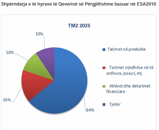 “Pjesën më të madhe të të ardhurave e përbëjnë: tatimet në produkte që paraqesin 64%; tatimet rrjedhëse në të ardhura (16%); aktivet dhe detyrimet financiare (10%). Ndërsa pjesa e mbetur është shpërndarë në kategori të tjera të të ardhurave”.