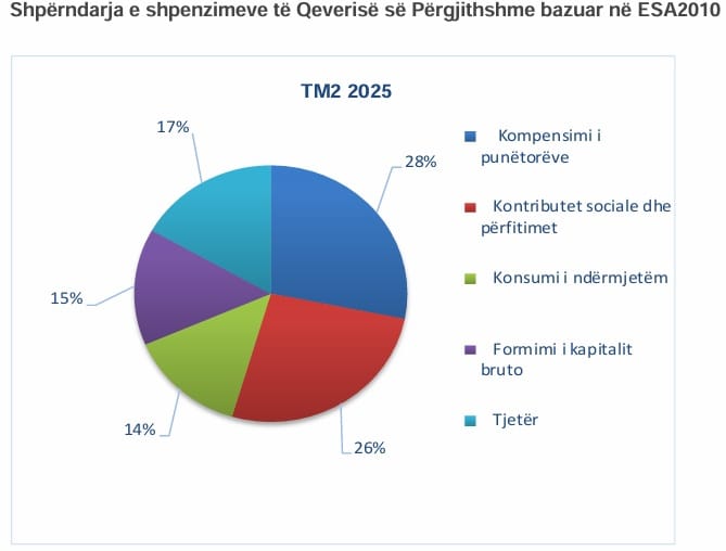 “Gjithsej shpenzimet e Qeverisë së Përgjithshme në TM2 2025 ishin 784.9 milionë euro, ndërsa shpenzimet në TM2 2024 ishin 679.1 milionë euro. Pjesën më të madhe të shpenzimeve e përbëjnë: kompensimi i punëtorëve (28%); kontributet sociale dhe përfitimet (26%); formimi i kapitalit bruto (15%); dhe konsumi i ndërmjetëm (14%). Ndërsa, pjesa e mbetur e shpenzimeve është shpërndarë në kategori të tjera të shpenzimeve: