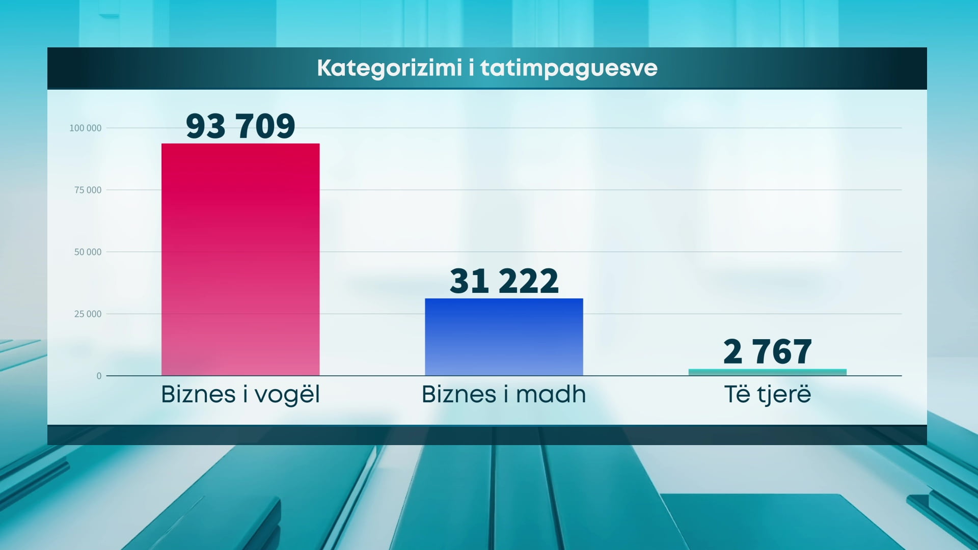 Sipas kategorizimit te tatimpaguesve, bazuar nivelit te qarkullimit te realizuar dhe vetëdeklaruar, në fund të vitit rezultojnë: 93,709 tatimpagues te regjistruar në biznes të vogël, 31,222 tatimpagues në biznes të madh dhe 2,767 të tjerë .