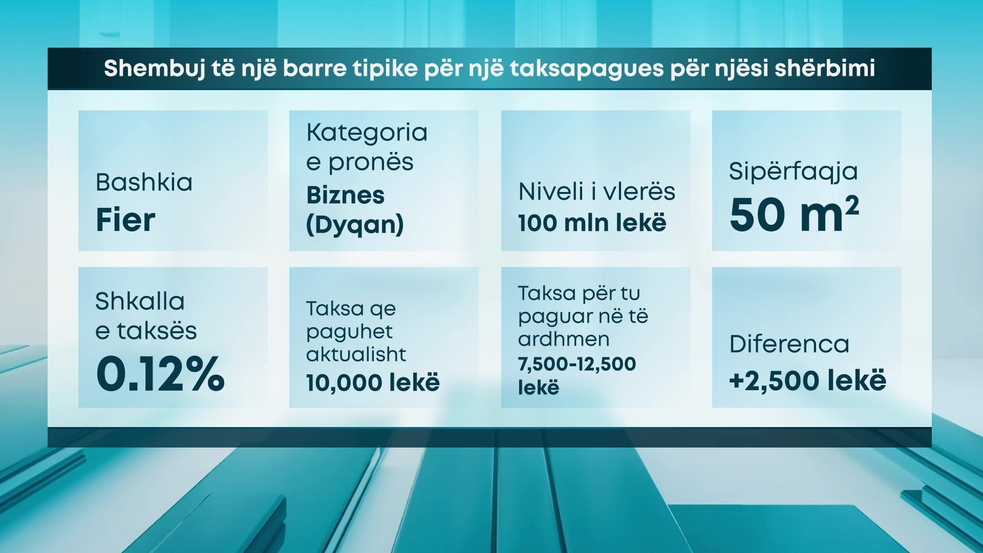 Për kategorinë e pronës dyqan në qytetin e Fierit me një vlerë 100 milionë lekë dhe sipërfaqe 50 m2, shkalla e taksës aktuale është 0,2 %, taksa vjetore që paguhet aktualisht është 10 mijë lekë, ndërsa me nivelet e propozuara, detyrimi për tu paguar varion nga 7500 lekë – 12.500 lekë, me një rritje maksimale që regjistrohet në 2500 lekë.