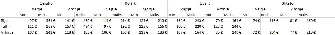 Ndërkohë, Tallin si destinacion i sapohapur shfaq çmime fillestare më të larta. Në qershor, një udhëtim vajtje-ardhje kushton nga 278 € deri në 652 €, por në korrik çmimet bien ndjeshëm në intervalin 222 € – 358 €.