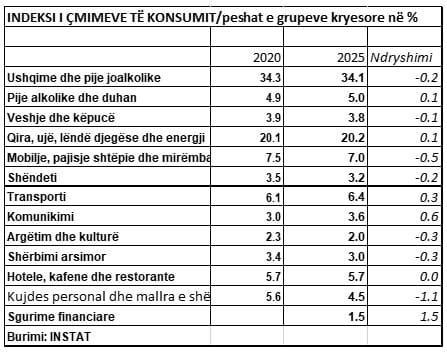 Struktura e shpenzimeve të familjeve shqiptare ka pësuar ndryshime të dukshme në periudhën 2020–2025, duke reflektuar, rritjen e pasigurisë financiare dhe transformimin e stilit të jetesës drejt shërbimeve digjitale dhe shpenzimeve më të domosdoshme.