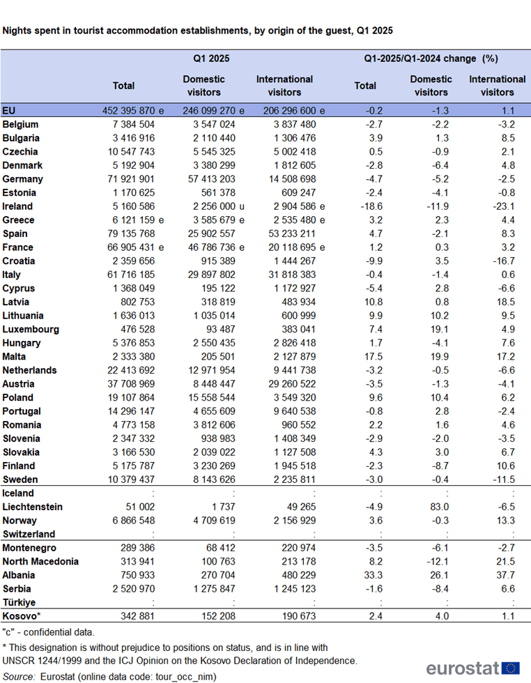 Në tremujorin e parë të vitit 2025, në Bashkimin Europian u regjistruan 452.4 milionë netë qëndrimi në struktura akomoduese turistike, duke shënuar një rënie të lehtë prej 0.2% krahasuar me të njëjtin tremujor të vitit 2024.