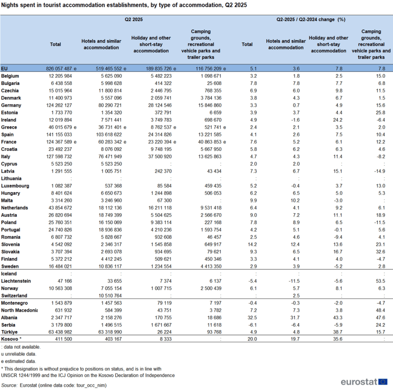 Sipas të dhënave të fundit të Eurostat, në periudhën prill–qershor në vend u regjistruan gjithsej 2,347,717 net-qëndrime. Rritja u nxitur kryesisht nga turistët e huaj, që shtuan qëndrimet me 34.2%, ndërsa ato të vendasve u rritën me 27.8% krahasuar me tremujorin e dytë 2024.