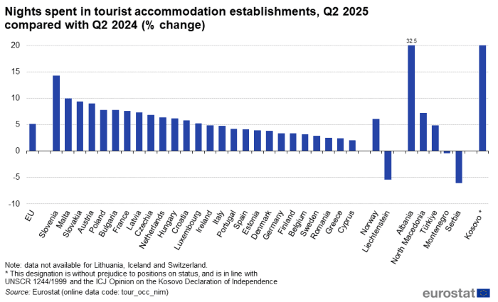 Rritjet më të mëdha të netëve të qëndrimit të vizitorëve të huaj u regjistruan në Maltë (+13.0%), Letoni (+12.8%) dhe Finlandë (+12.3%). Në krahun tjetër, Irlanda (-6.1%), Suedia (-5.3%) dhe Gjermania (-2.9%) ishin të vetmet vende që përjetuan rënie.