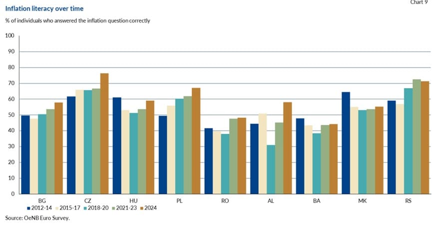 Në vende si Çekia, Polonia dhe Serbia, njohuritë mbi inflacionin janë rritur ndjeshëm me kalimin e viteve. Çekia ka arritur nivelin më të lartë, me mbi 75% të qytetarëve që në vitin 2024 dhanë përgjigje të saktë për inflacionin. Serbia, gjithashtu, ka shënuar progres të dukshëm, duke kaluar nga rreth 60% në vitet e para të matjes në mbi 70% në 2024.