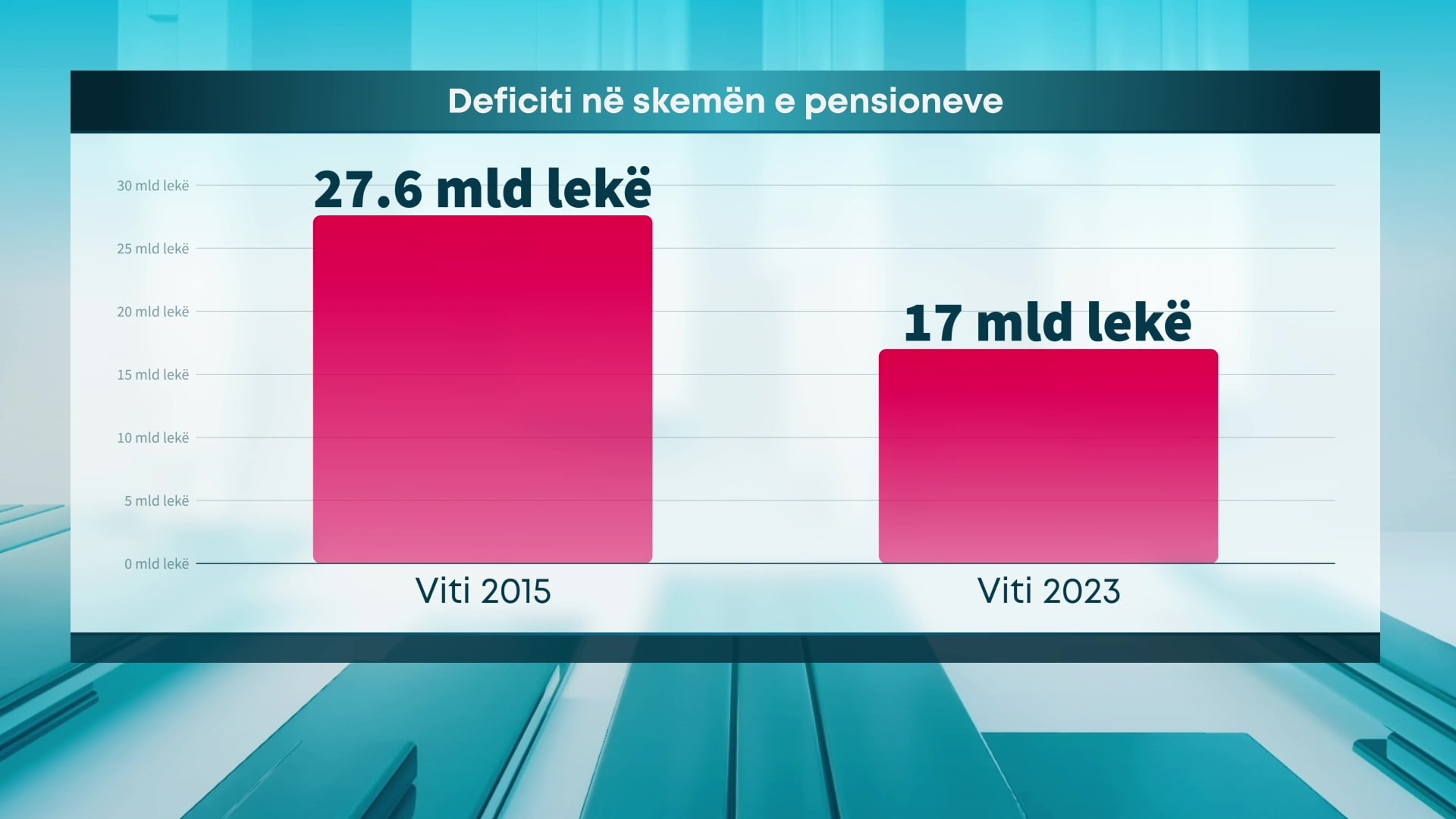 Më konkretisht, deficiti i skemës së pensioneve është ulur nga 27.6 miliardë lekë në vitin 2015 në 17 miliardë lekë në vitin 2023 ose nga 1.93% e PBB në rreth 0.8 % e PBB.