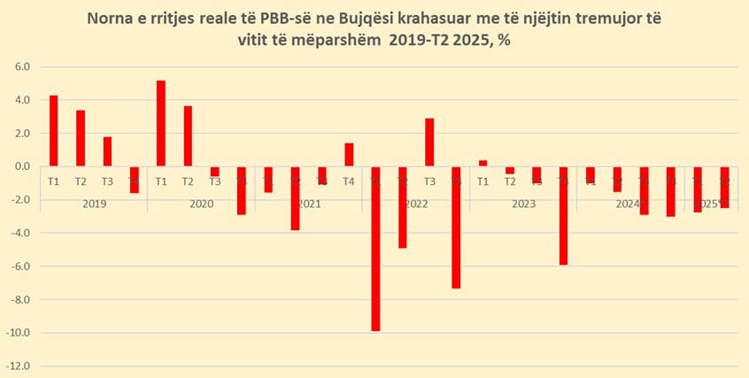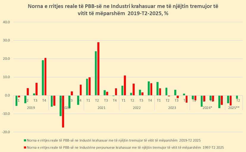 Ky trend u përmbys në vitin 2024, kur të katër tremujorët shënuan tkurrje të prodhimit industrial, me norma që shkuan deri në -8 për qind. Në dy tremujorët e parë të vitit 2025, industria dhe industria përpunuese kanë vijuar sërish me rënie, duke konfirmuar një krizë të zgjatur strukturore.