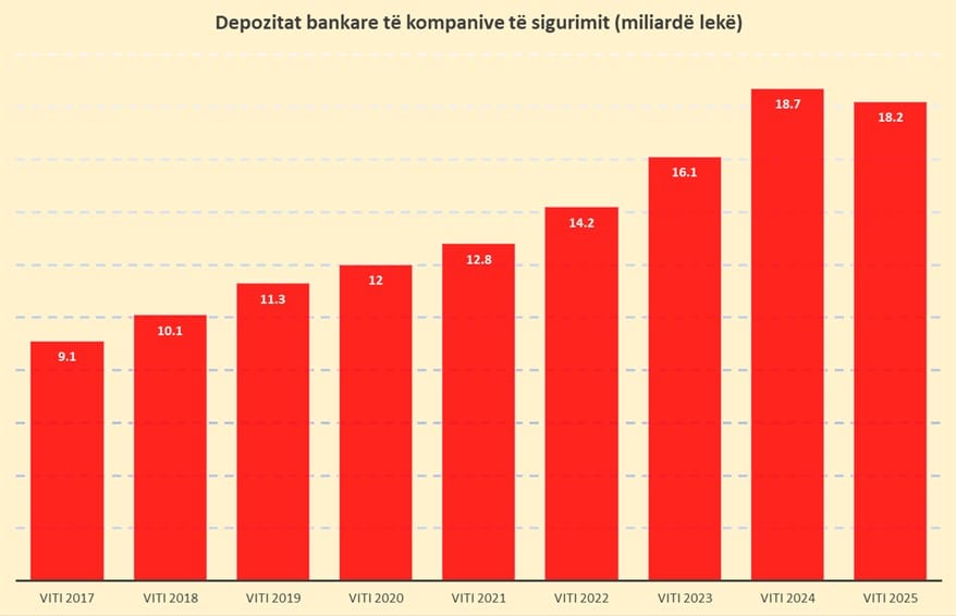 Sipas të dhënave nga Autoriteti i Mbikëqyrjes Financiare (AMF), depozitat bankare të shoqërive të sigurimit në fund të 2025 arritën vlerën e 18.2 miliardë lekëve (rreth 188 milionë euro), në rënie me 2.7% krahasuar me një vit më parë.