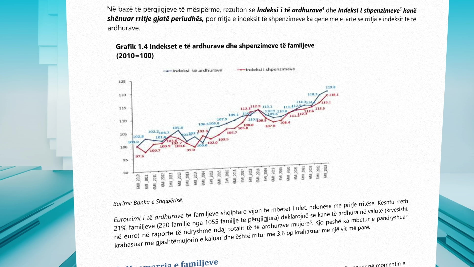 Shpenzimet e familjeve po rriten shumë më shpejt se të ardhurat e tyre. Konkluzioni vjen përmes një analize që Banka e Shqipërisë u ka bërë dy zërave. Sipas Bankës, në shpërndarjen e familjeve sipas nivelit të shpenzimeve të domosdoshme të jetesës, gjatë gjysmës së parë të këtij viti, vihet re që struktura ka vijuar të zhvendoset drejt dy niveleve më të larta të shpenzimeve mujore (“50 mijë-100 mijë lekë” dhe “mbi 100 lekë në muaj”), duke reflektuar në këtë mënyrë rritjen e kostos së jetesës së familjeve për shkak të rritjes së çmimeve në vend.