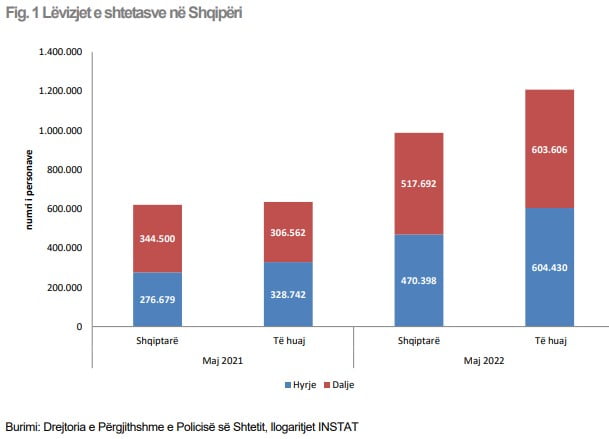 “Daljet e shtetasve shqiptarë dhe të huaj nga territori i Shqipërisë, gjatë muajit Maj 2022, janë 1.121.298 duke shënuar një rritje me 72.2%, krahasuar me të njëjtën periudhë të një viti më parë. Daljet e shtetasve shqiptarë nga territori i Shqipërisë, gjatë muajit Maj 2022 janë 517.692.