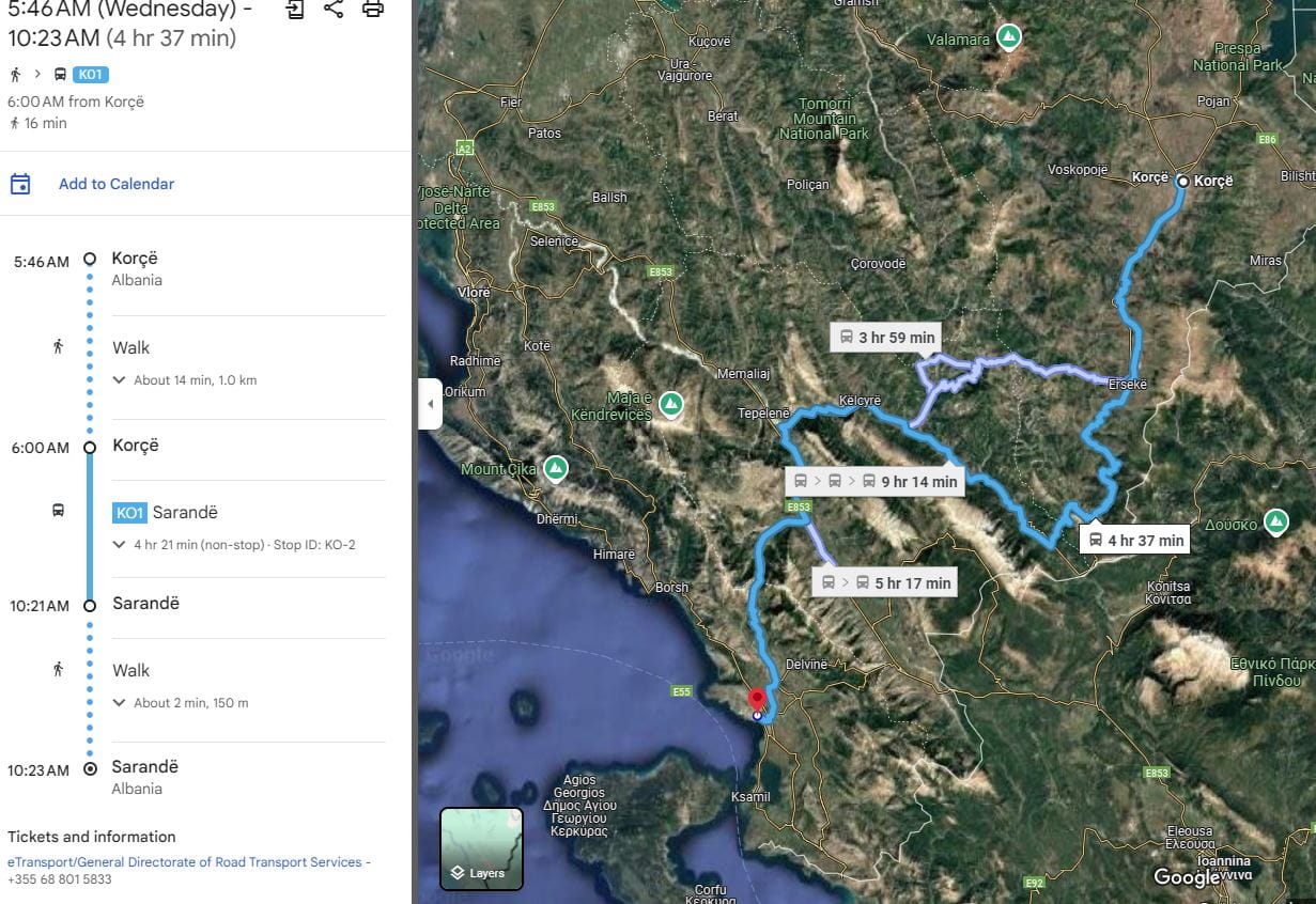Për shembull nëse doni të shkoni nga Korça në Sarandë keni dy mundësi sipas asaj që gjeneron harta. Mundësia e parë është të kaloni nga Gjirokastra. Kështu në Korçë do të merrni autobusin GJ5 nga Terminali dhe do të mbërrini në Gjirokastër në një rrugëtim që zgjat tre orë. Aty me pas do të merrni autobusin Gj3 që do t’ju çojë drejt Sarandës në një rrugë që zgjat pak më shumë se një orë.