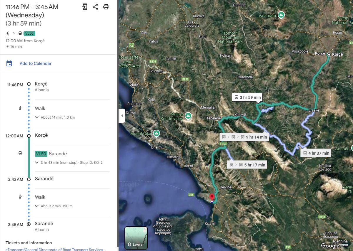 Mundësia e tretë është një linjë direkte që niset nga Korça në Sarandë me autobusin KO1 në një rrugë që zgjat 4 orë e 37 minuta.