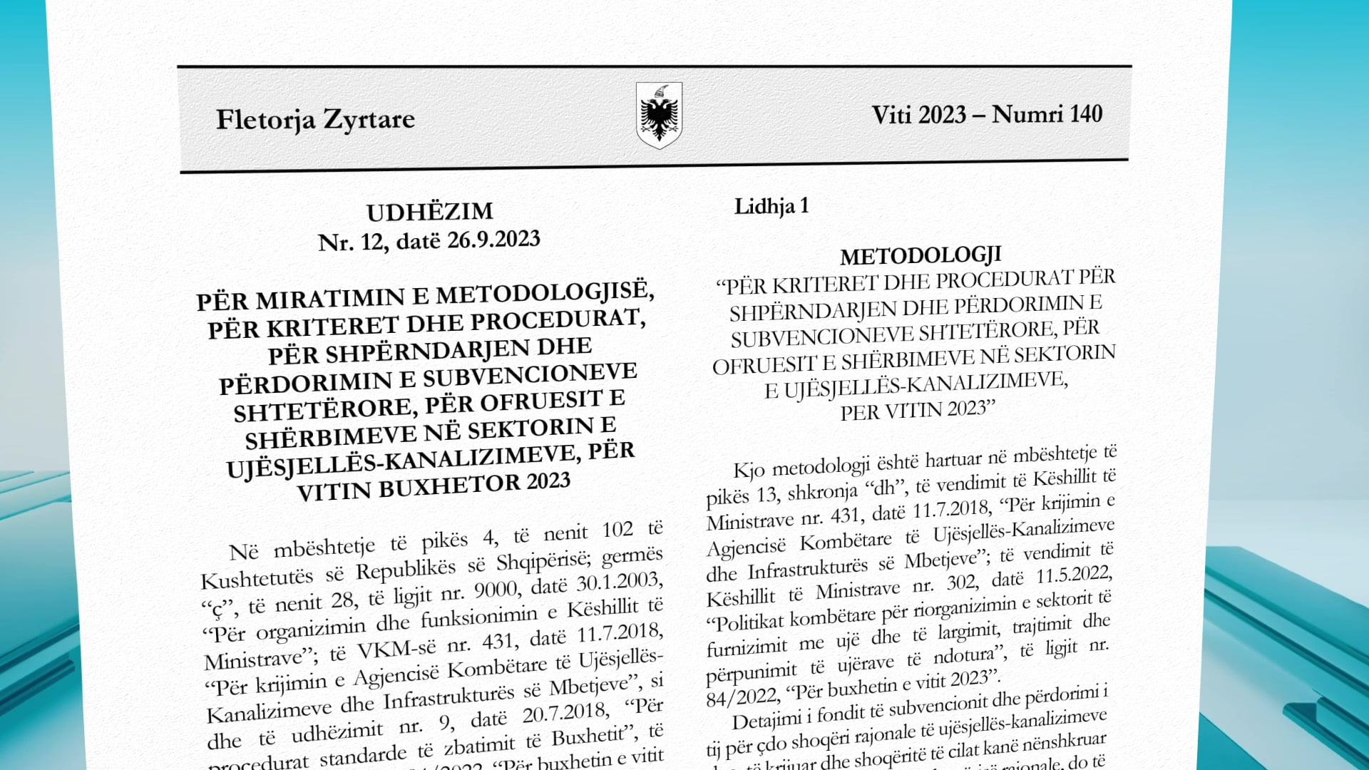 Shoqëritë rajonale të ujësjellësve do të përfitojnë 30 mln lekë subvencion nga Agjencia Kombëtare e Ujësjellës Kanalizimeve. Ministria e Infrastrukturës dhe Energjisë ka miratuar metodologjinë që do të përdoret për shpërndarjen e e subvencioneve, duke përjashtuar ato shoqëri që nuk përmbylin procedurat e agregimit brenda vitit 2023.