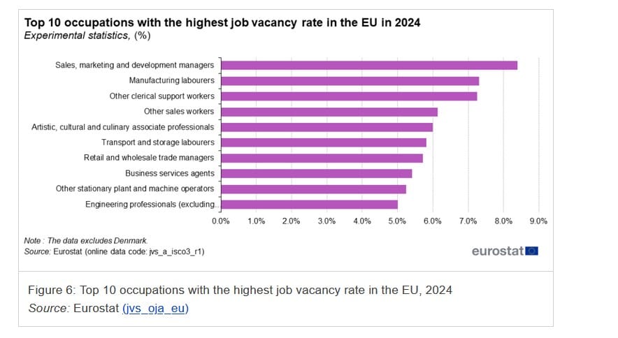 Në vendet e BE sipas Eurostat, pas menaxherëve dhe punonjësve të fabrikave, kategoritë e tjera “Punëtorë të tjerë të shitjeve” (6.1%) dhe “Profesionistëve të asociuar artistikë, kulturorë dhe të kuzhinës” (6.0%) plotësojnë 5 profesionet kryesore me shkallët më të larta të vendeve të lira të punës.