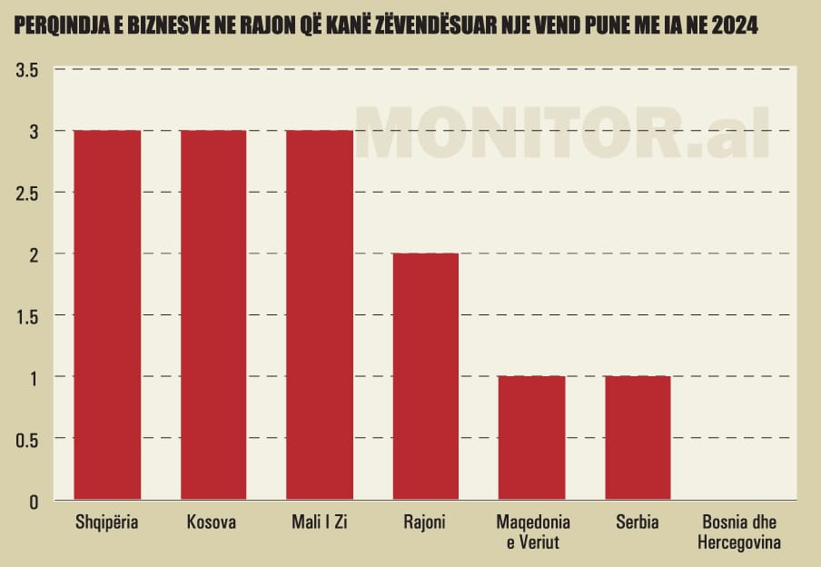 Të dhënat e fundit të Barometrit të Ballkanit, që i takojnë vitit 2024, treguan se në Shqipëri, 3% e bizneseve kishin automatizuar apo zëvendësuar një pozicion pune ekzistues nëpërmjet teknologjive të Inteligjencës Artificiale, një përqindje më e lartë se mesatarja e rajonit, që është 2%.