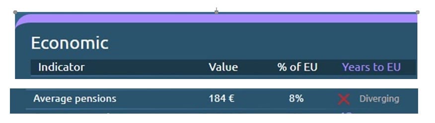 Pas vitit 2018, trendi ndryshoi ndjeshëm, pasi në 2019 – 2020 pensioni mesatar në vendin tonë zbriti sa 7.7% e nivelit të BE-së. Në vitin 2022 ka rimëkëmbje të lehtë duke u ngjitur në 8% të mesatares së BE-së.