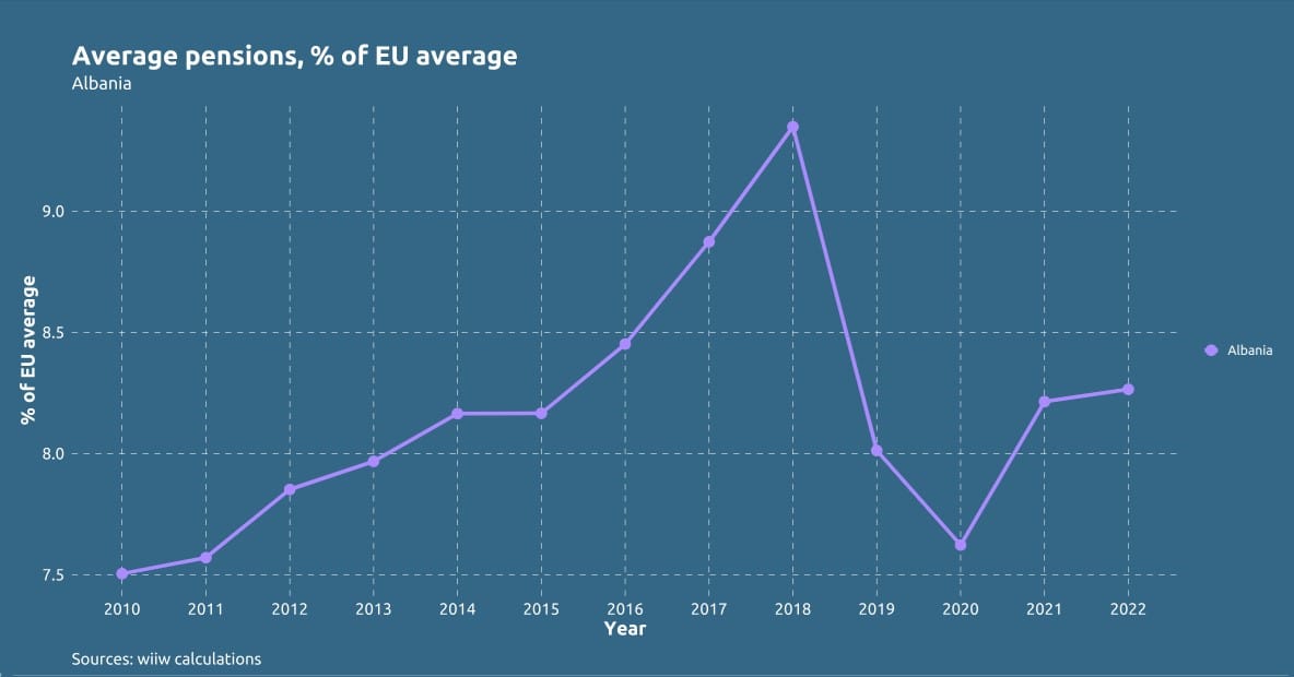 Në fillim të dekadës, në vitin 2010, pensionet shqiptare ishin sa 7.5% të mesatares së BE-së, një nivel shumë i ulët në krahasim me standardet europiane. Gjatë viteve në vijim kishte një rritje e qëndrueshme, duke arritur kulmin në vitin 2018, kur pensionet shqiptare arritën në rreth 9.3% të mesatares së BE-së. Ky ishte momenti më i favorshëm përgjatë 2010-2022.